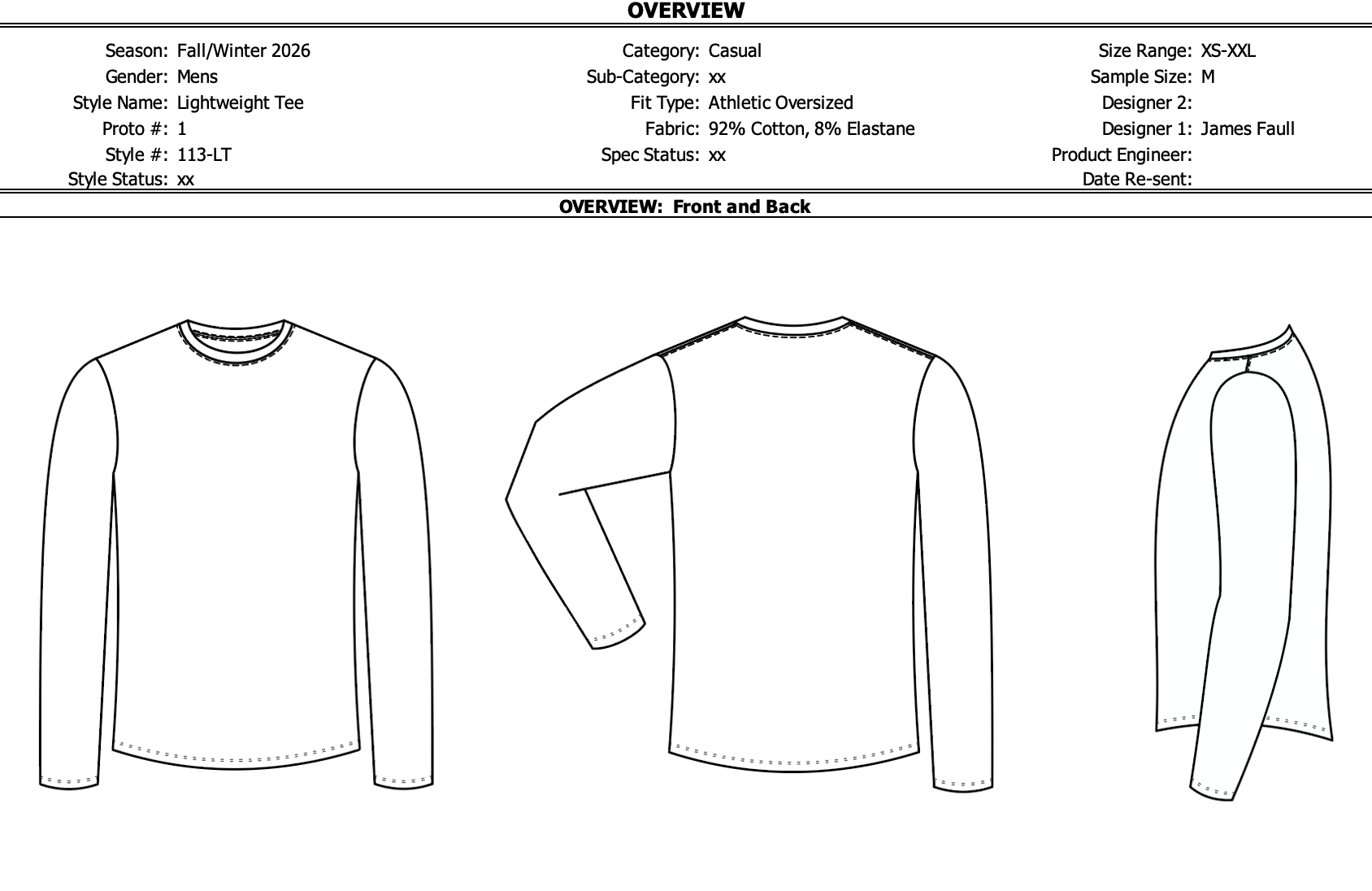 This project presents a conceptual winter line for Arc’teryx, featuring a snow kit and lifestyle garments. Alongside a complete line plan, the collection includes required woven and knit variations, as well as an original surface pattern designed to reflect the brand’s aesthetic. While the line served as a learning experience, the designs are clean and cohesive. As my first project using Adobe Illustrator, as well as tech pack creation, this body of work reflects strong progress in technical flats, layout, and digital design fundamentals.